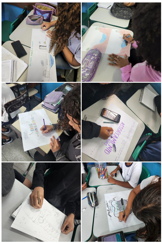 Através de pesquisas, os alunos construíram mapas mentais, desenhos, maquetes e outros recursos didáticos que demonstrassem os principais problemas encontrados: assoreamento, poluição e enchentes.