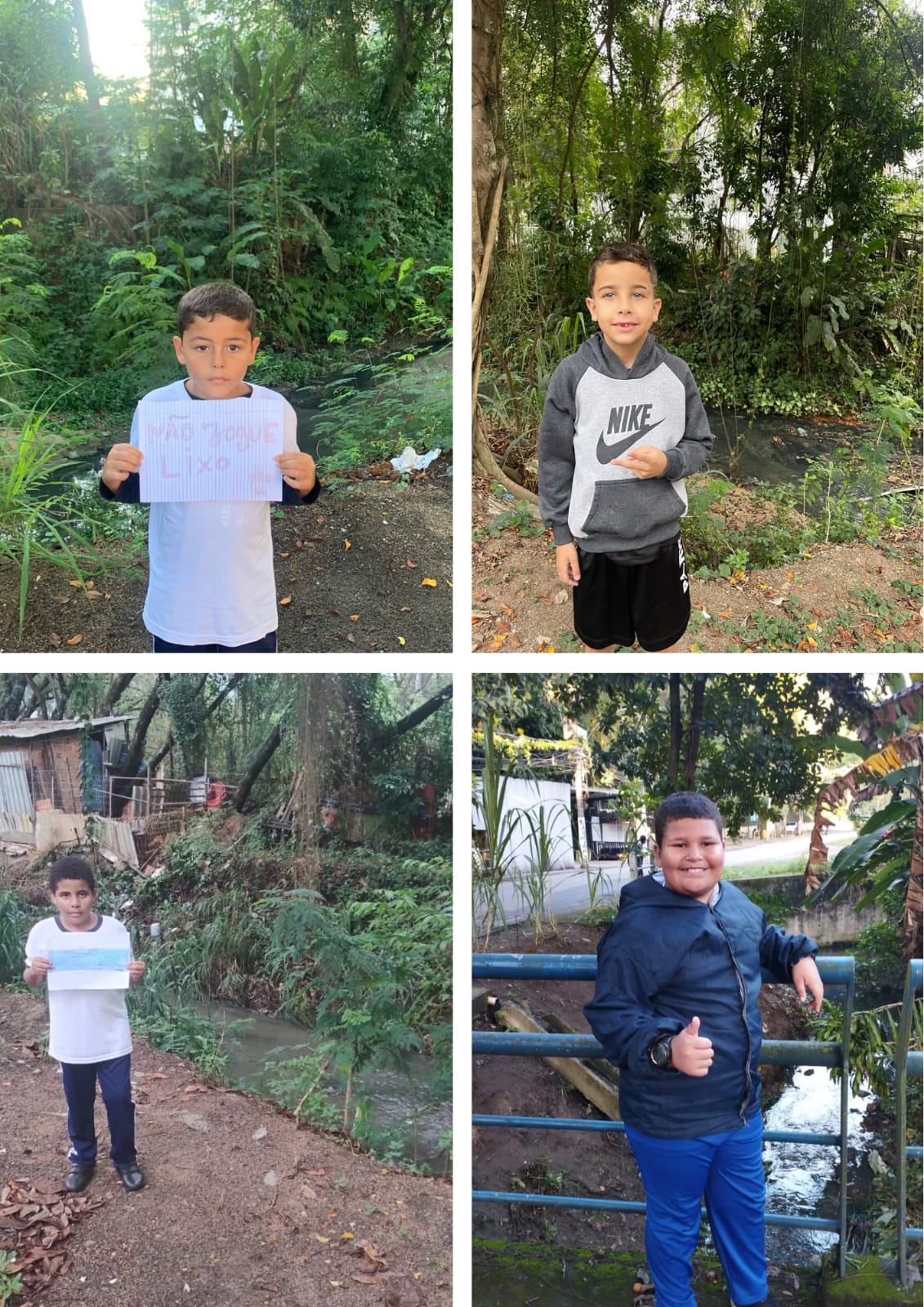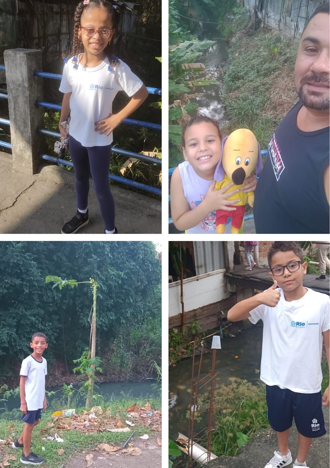Pesquisa sobre poluição do rio, apresentação e organização de trabalhos em grupo, observação e foto com a família próximo ao Rio.