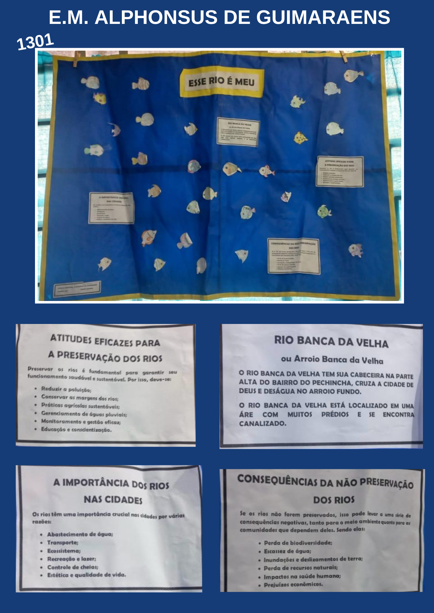 Descrição das atividades / Gratas surpresas: As atividades se deram ao longo do bimestre e primeiro os alunos conheceram o rio através de pesquisas e puderam em roda de conversa contextualizar com suas memórias e pertencimento local. Depois através de vídeos, livros e bate-papos discutiram sobre a importância de sua preservação com o cuidado com o lixo, o uso de sua água, possibilidades e as consequências da não preservação. Puderam também discutir sobre as razões da existência dos rios nas cidades.